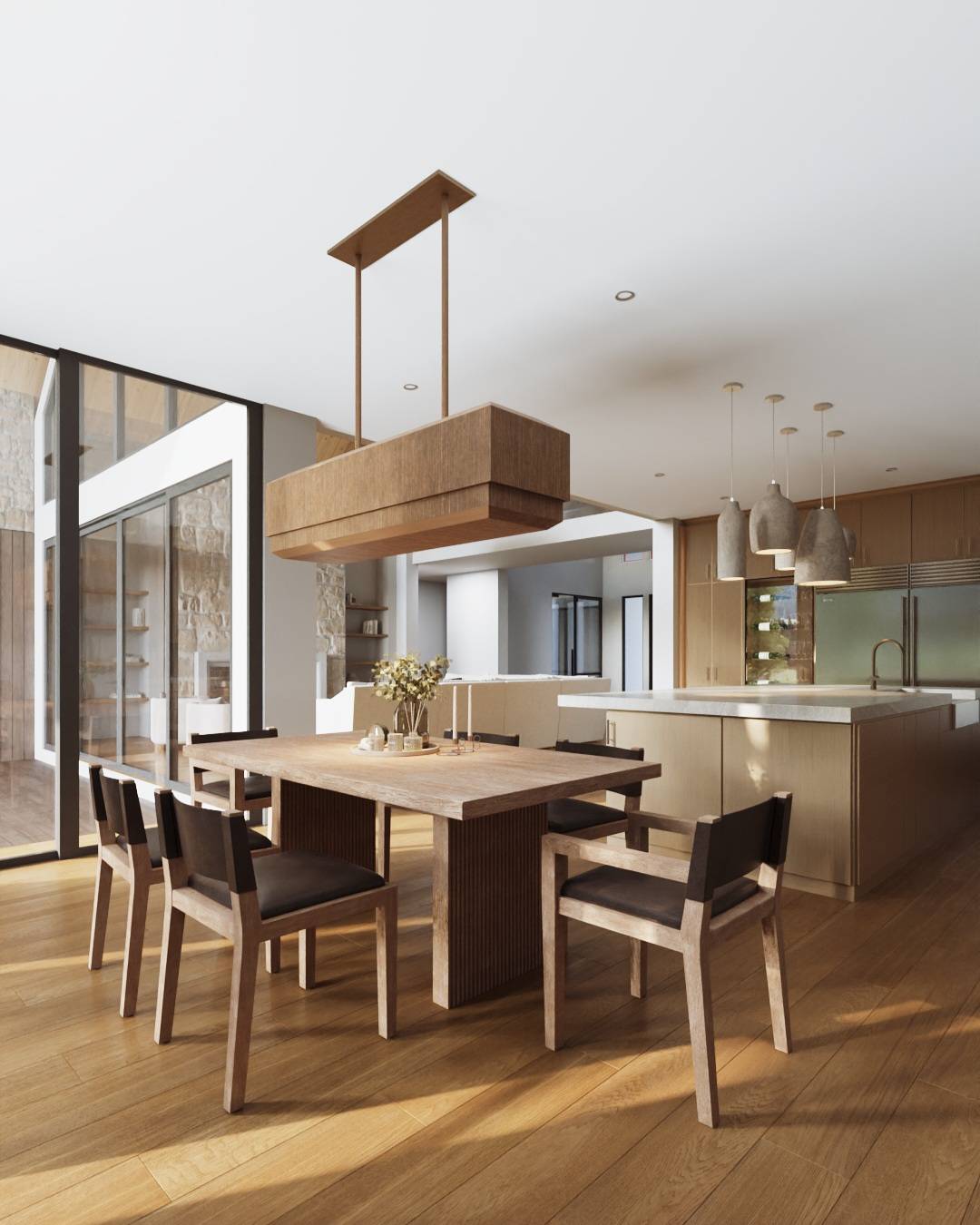 A modern retreat visualized across six spaces. The great room with cathedral ceilings, exposed pine beams, and floor-to-ceiling glass opening to the mountain. A limestone fireplace wall with live fire. A basement bar built around green marble, copper pendants, and a wall of forest glass. A back kitchen in pale oak centered on a garden door. An upstairs loft with warm built-ins, dual workstation, and sculptural plaster relief. And a dining space anchored by a solid oak table and wood box pendant.