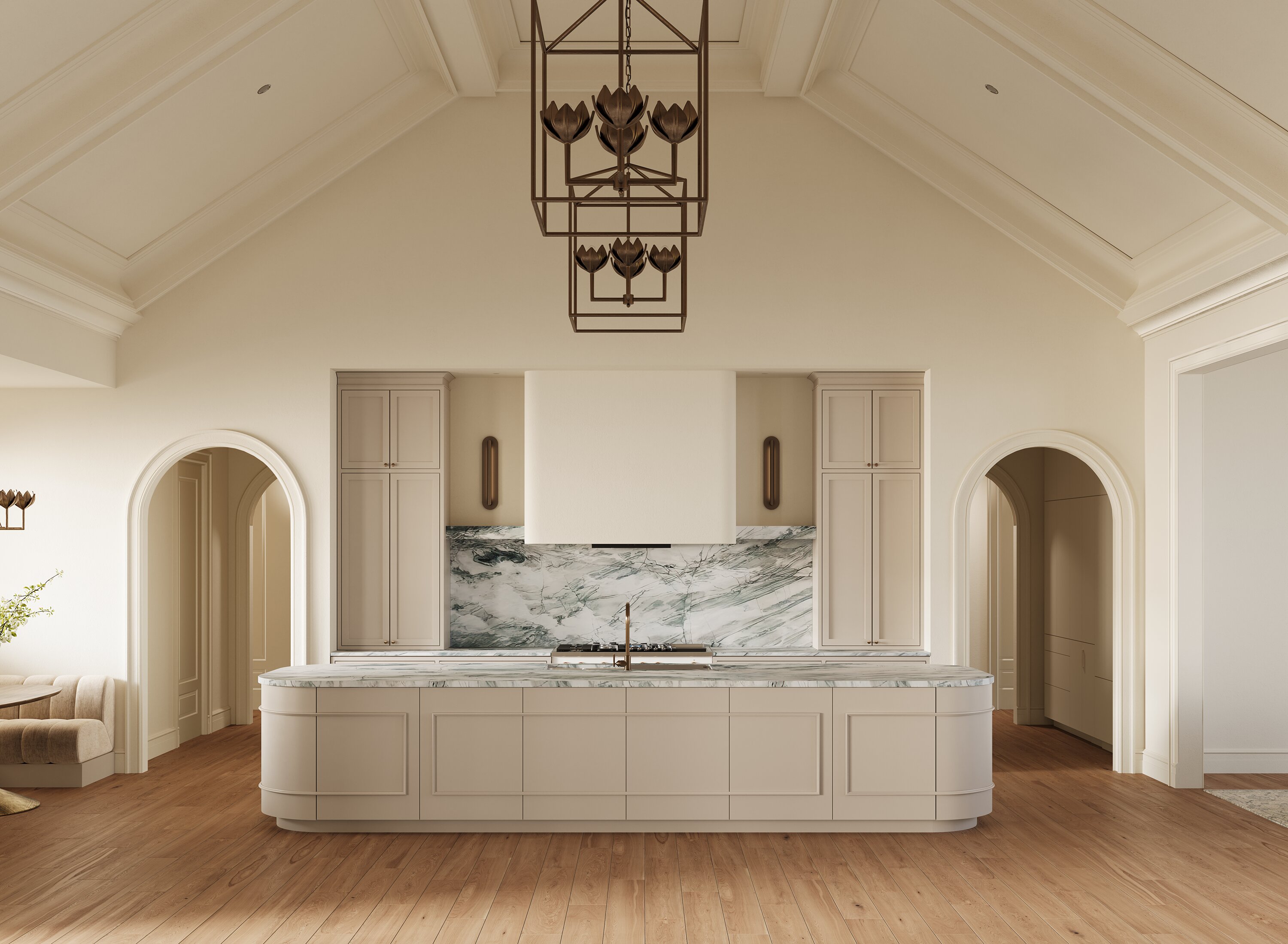 A traditional home visualized across six spaces. The exterior at dusk, white brick, gas lanterns, cedar shake roof, lake visible from the rear. Inside, a cathedral great room anchored by a floor-to-ceiling stone fireplace and live fire. A vaulted kitchen built around a curved island and dramatic green veined marble backsplash. A formal dining room set for twelve beneath a brass candelabra chandelier and coffered ceiling. A velvet banquette nook with a bronze lotus pendant and cherry blossom arrangement facing the lake. And a butler's pantry with glass front cabinetry and the same marble running through.