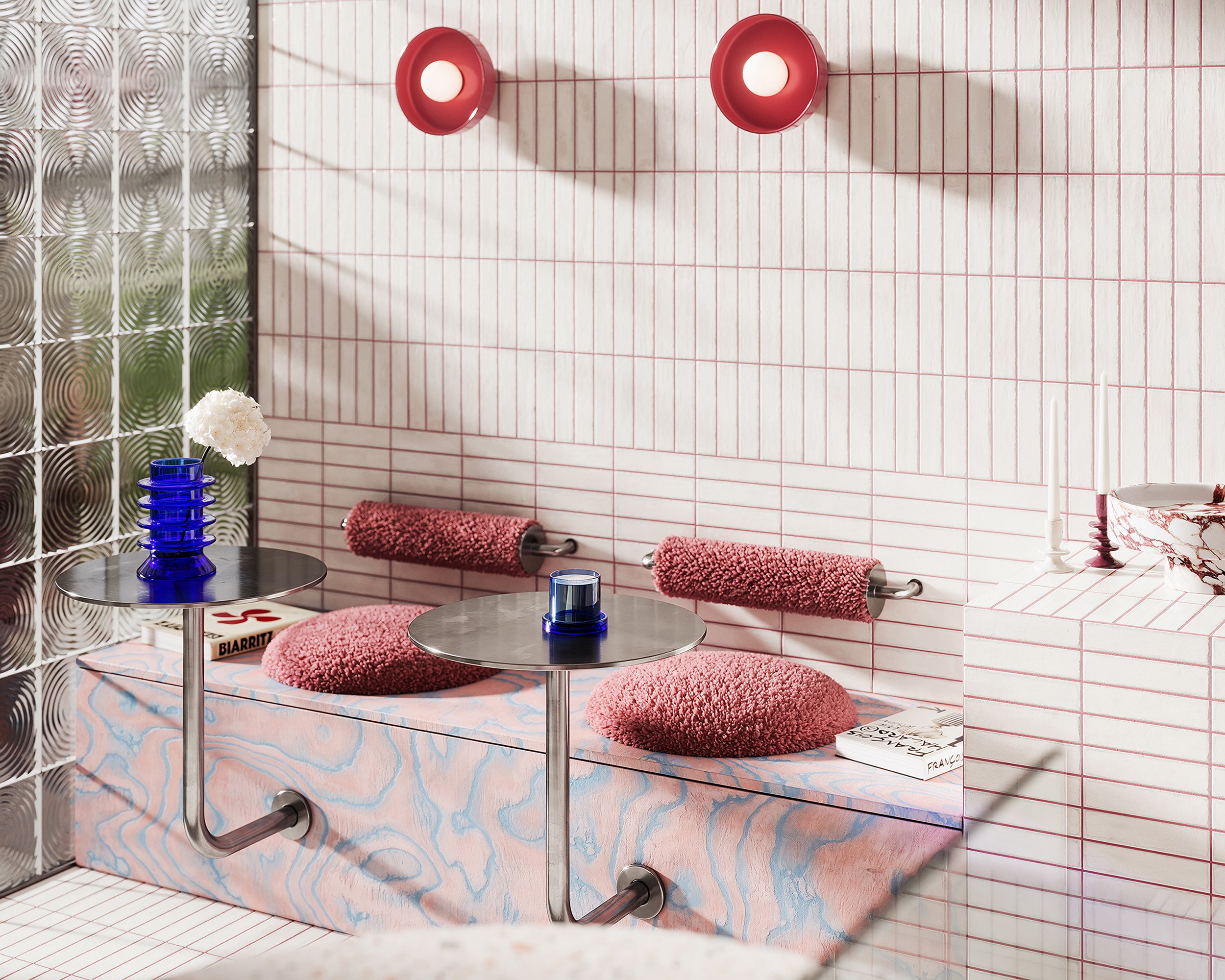 The cafe’s centerpiece is the counter zone a sculptural piece in itself featuring fluid, wavy panels with marbled patterns in pink and blue tones. This focal element sets the tone of the interior, guiding the customer journey and drawing the eye to the carefully curated pastries and coffee station. Above, oversized red tubular lighting fixtures drop dramatically from the ceiling, doubling as both functional light sources and artistic interventions.